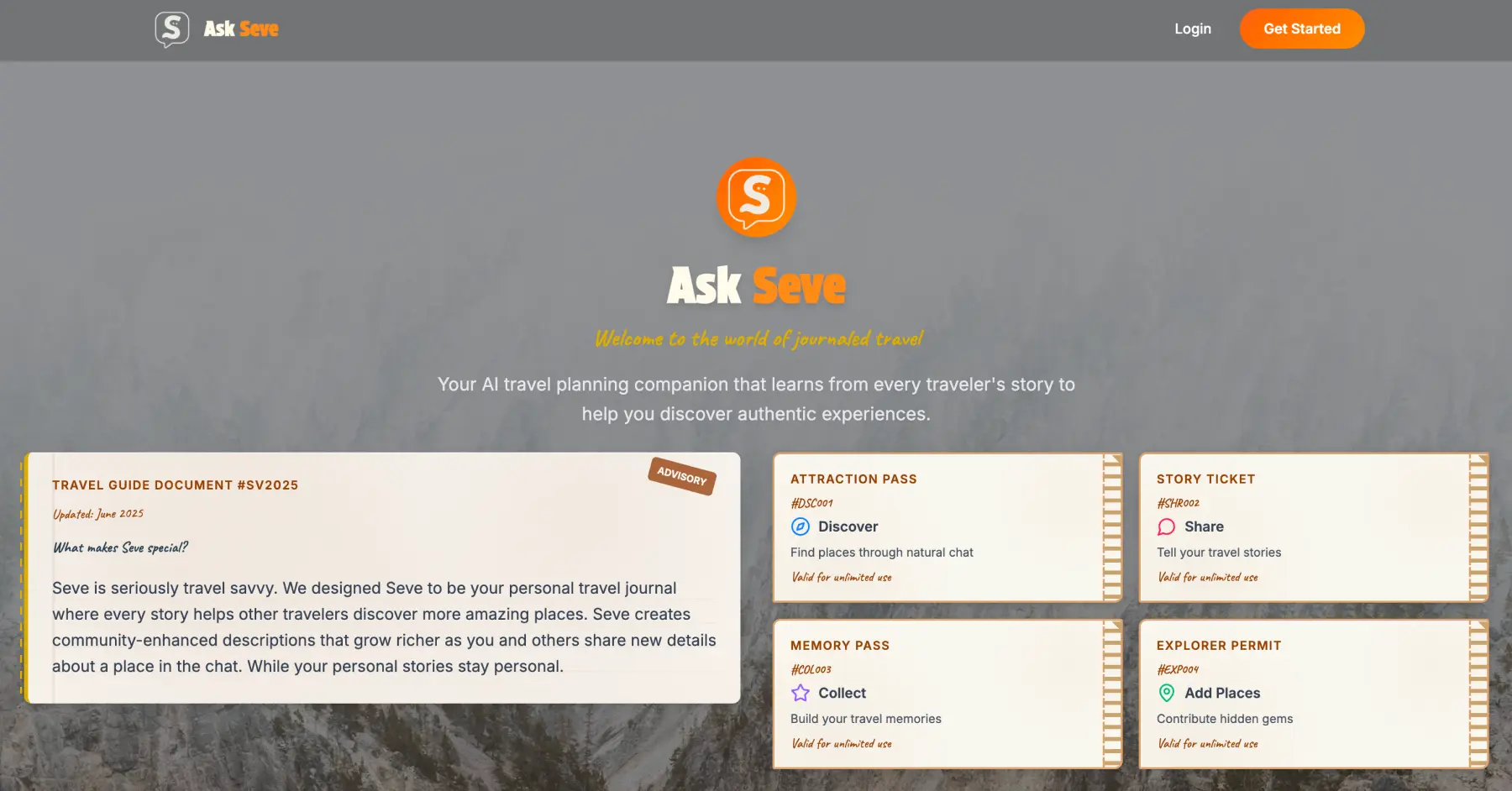 Ask Seve is an AI travel companion that helps travelers discover destinations and plan adventures through conversation. Travelers use it to get personalized destination recommendations, explore hidden gems through AI-powered suggestions, and build travel memories by sharing their stories and experiences with an intelligent assistant that learns their preferences.